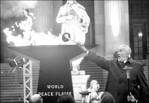 El actor británico Christopher Lee enciende la Llama de la Paz Mundial, similar a la que se encuentra en la Corte de Justicia en La Haya. El acto es parte de la gala de caridad que se efectúa en Berlín, denominada Cinema por la Paz FOTO AFP