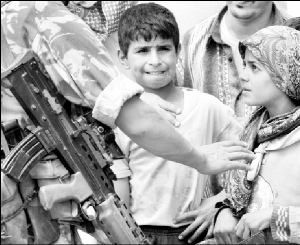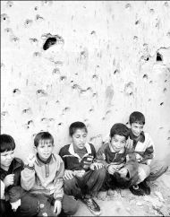 Un grupo de niños iraquíes frente a un muro ametrallado en Fedayliye, 15 kilómetros al sureste de Bagdad, donde un misil de las fuerzas invasoras provocó seis muertos y 33 heridos FOTO AFP