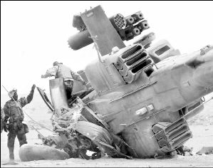 Oficiales estadunidenses examinan los restos de un helicóptero Apache que se estrelló el domingo después de despegar de una base en el desierto iraquí, con saldo de dos pilotos heridos FOTO AFP