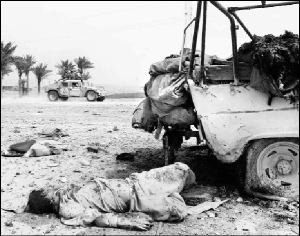 Soldados estadunidenses de la 101 División Aerotransportada pasan frente a los cadáveres de efectivos iraquíes en ciudad de Kifl, al sur de Bagdad FOTO REUTERS