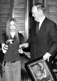La cantante canadiense Avril Lavigne reaccionó así al recibir, de manos del primer ministro Jean Chrétien, el disco de diamante que certifica la venta de un millón de copias de su más reciente material discográfico en ese país norteamericano FOTO REUTERS