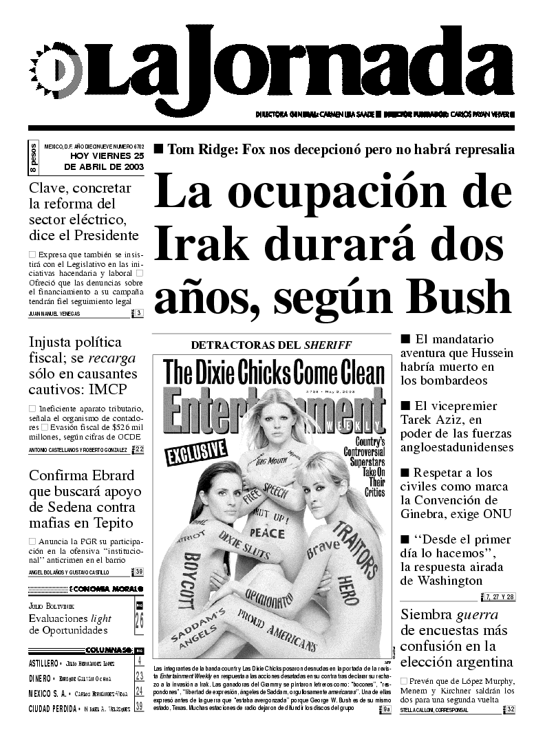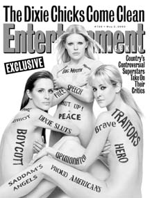 Las integrantes de la banda country Las Dixie Chicks posaron desnudas en la portada de la revista Entertainment Weekly en respuesta a las acciones desatadas en su contra tras declarar su rechazo a la invasión a Irak. Las ganadoras del Grammy se pintaron letreros como: "bocones", "respondones", "libertad de expresión, ángeles de Saddam, orgullosamente americanas". Una de ellas expresó antes de la guerra que "estaba avergonzada" porque George W. Bush es de su mismo estado, Texas. Muchas estaciones de radio dejaron de difundir los discos del grupo FOTO AFP