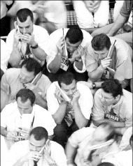 Tras las alzas de los dos últimos días, que habían llevado a índices máximos en al menos tres meses, Wall Street cerró ayer con bajas después de que los inversionistas, nerviosos por los inciertos panoramas de algunas compañías, tomaran utilidades. No obstante, los tres principales índices accionarios terminaron por arriba de sus peores niveles de la sesión: Dow Jones perdió 0.89 por ciento, mientras Standard & Poor's 500 cayó 0.83 por ciento y Nasdaq decreció 0.61 por ciento. En la gráfica, corredores de la bolsa de Sao Paulo FOTO REUTERS