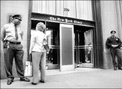 The New York Post publicó en primera plana una oferta de empleo satírica en nombre de su archirrival, el Times. "Se necesita director para diario con base en Manhattan. Izquierdista, francófilo, con obsesiones diversas y talento para frenar la caída de circulación. Alergia a los republicanos, deseable (...) Respeto a los hechos, opcional", reza la parodia.