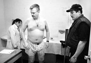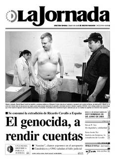 Sérpico al desnudo. Ricardo Miguel Cavallo fue sometido a exámenes médicos en el Reclusorio Oriente antes de ser trasladado al aeropuerto de la ciudad de México, de donde partió a España en un avión de la Fuerza Aérea de ese país para ser sujeto a juicio como presunto responsable de genocidio y terrorismo durante la dictadura argentina (1976-83). Con la entrega acaban tres años de litigio que al final resolvió la Suprema Corte de Justicia de la Nación, al convalidar la extradición del ex teniente de fragata, celebrada ayer por una multitud de argenmex en la terminal aérea capitalina FOTO CARLOS RAMOS MAMAHUA