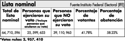 Las elecciones federales de este domingo registraron el mayor abstencionismo en la historia reciente del Instituto Federal Electoral (IFE), cuyos integrantes, a pesar de la ''satisfacción'' por el éxito en la organización del proceso, asumen el fracaso de la escasa participación. Empero, las causas son diversas: responsabilidad central de los partidos y sus campañas de ataques; la confrontación entre el organismo electoral y el Ejecutivo por la promoción del voto; desaliento de las expectativas de la democracia, y la insatisfacción que ésta ha provocado entre el electorado.