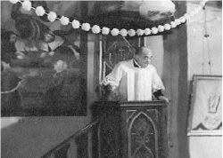 Buñuel/sacerdote trepado en el púlpito arengando a los fieles.