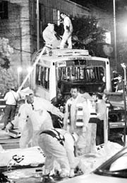 Socorristas atienden a víctimas del ataque suicida en un autobús, en el que murieron al menos 20 personas y más de 100 resultaron heridas. Los grupos de resistencia Hamas y Jihad Islámica se adjudicaron la acción. En respuesta, el gobierno de Israel decidió suspender todo contacto con las autoridades palestinas FOTO AFP