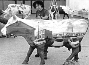 BOVINOS ANDANTES  En Tokio, Daisuke Samejima da los últimos toques a una escultura de fibra de vidrio con la que participará en la muestra mundial Desfile de vacas. El artista japonés creó 64 obras vacunas, que serán exhibidas en la capital japonesa del 5 de septiembre al 5 de octubre. Después serán subastadas y los recursos se entregarán a instituciones asistenciales FOTO AFP