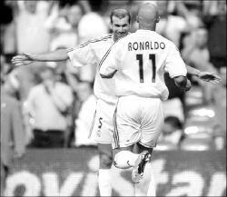 Zinedine Zidane y Ronaldo celebran el segundo gol merengue anotado en el partido contra el Real Betis al iniciar la temporada del futbol español FOTO AFP