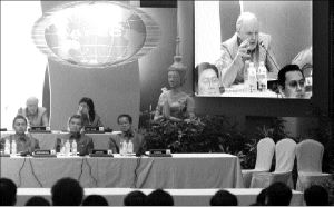 EU PIDE LIBRE MERCADO CAMBIARIO EN ASIA  El secretario del Tesoro de Estados Unidos, John Snow, en la pantalla, pidió, durante la décima Reunión de ministros de finanzas del APEC, a los gobiernos de Asia, que "saquen las manos" de los mercados cambiarios y que sean la oferta y la demanda las que regulen las cotizaciones de las monedas FOTO REUTERS