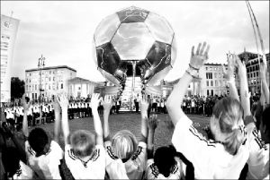 En Berlín, jóvenes forman un círculo alrededor de un balón gigante, al iniciar la cuenta regresiva rumbo a la Copa del Mundo Alemania 2006 FOTO AFP