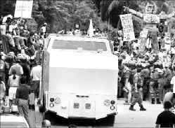 la potencia del tanque antimotines estacionado en la retaguardia de los