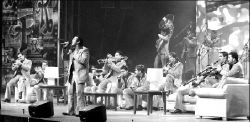Ya se hizo la machaca, De Sinaloa salí. Al fondo del escenario, en una pantalla una imagen de un fuego que ha ardido durante 65 años. Llegaste tú. Sube el mariachi. Se sientan en unos sofás. Que te ruegue quien te quiera. Pura onda machín. Ambiente de carnaval. Chiflidos contra Cuauhtémoc Blanco, sentado en segunda fila, cerca de Ninel Conde.