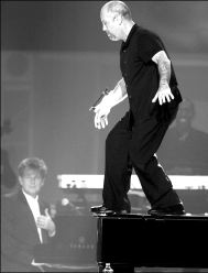 ALTRUISMO EN LAS VEGAS  El cantautor Billy Joel se balancea en el filo de su piano, listo para saltar, durante su actuación en el concierto anual de la Fundación Andre Agassi Gran Slam de Caridad para los Niños, que se llevó a cabo en la Gran Arena MGM, de Las Vegas. También participaron Sheryl Crow, Elton John, Tears for Fears, entre otros. La recaudación obtuvo el récord de 12.6 millones de dólares FOTO REUTERS