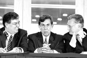 Enfrentados después de los comicios de 1988, adversarios de entonces hasta ayer, el perredista y el priísta participaron, codo a codo, en el anuncio de una serie de acciones en defensa del sector energético, acto que respaldaron líderes sindicales y legisladores opositores a los planes foxistas. "El pasado no lo vamos a mover, pero primero está el interés de la nación", expresó el ingeniero. A la izquierda, José Murat, gobernador de Oaxaca FOTO JOSE CARLO GONZALEZ