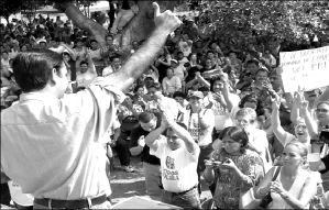 MITIN POLITICO EN COLIMA  Antonio Morales de la Peña, candidato a gobernador por la coalición PAN-PRD-Asociación por la Democracia, durante un mitin en el jardín de San Francisco. La elección será el 7 de diciembre FOTO PABLO CERNA