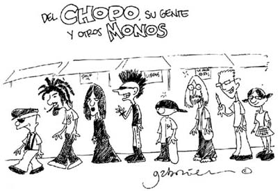 LA GALERIA CENTRAL del Tianguis Cultural del Chopo se ha convertido en centro de operaciones de un grupo de jóvenes dibujantes, caricaturistas y pintores. En este sitio han montado exposiciones caricaturistas de la talla de Ahumada, Manjarrez y Rocko, y este sábado estará, por segunda semana, la exposición Del Chopo, su gente y otros monos, del caricaturista Gabriel, quien hace ocho días saboreó lo agradable de congregar visitantes durante más de cuatro horas consecutivas. Hubo fila casi permanente de chavos para que Gabriel -dibujante de un periódico deportivo- les hiciera su caricatura; a su lado estuvo Rocko vendiendo imágenes de rockeros impresas en papel, camisetas y calcomanías.