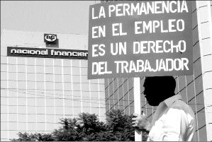 Un momento de la manifestación de trabajadores despedidos de Nafin para denunciar a los directivos de la banca de desarrollo, el 12 de noviembre de 2003 FOTO JOSE CARLO GONZALEZ
