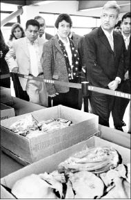 HALLAZGO  El jefe de Gobierno del Distrito Federal, Andrés Manuel López Obrador, observa los restos arqueológicos encontrados durante la construcción de la preparatoria Fray Bernardino de Sahagún, en la delegación Xochimilco, en un recorrido por el plantel FOTO FRANCISCO OLVERA