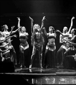 metros sobre el escenario, elevada por un arnés. Gira sobre su propio