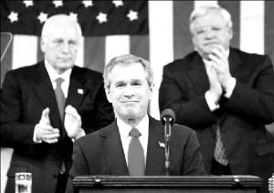 Sentado detrás de él, y no explícitamente reconocido por el mandatario estaba el fundador del Congreso Nacional Iraquí, Ahmed Chalabi. Fue la primera vez que un criminal condenado por malversación de fondos en Medio Oriente ha sido invitado a presenciar el informe anual del presidente.