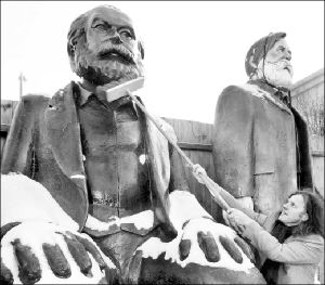 LOS PADRES DEL COMUNISMO  Friedhelm Schatz, gerente de Filmpark Babelsberg, en Postdam, retira la nieve de estas dos réplicas de las estatuas de los padres del comunismo, Karl Marx y Friedrich Engels, en Berlín. Una vez renovadas, los estatuas formarán parte de la decoración de los estudios, a las afueras de la capital alemana FOTO AFP