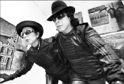 con sombreros de fieltro negro, lentes oscuros saltones, pantalones azul