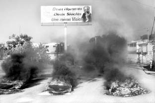 Simpatizantes del presidente Jean Bertrand Aristide incendiaron pilas de llantas en una avenida de Puerto Príncipe para evitar el paso de una marcha de opositores. La crisis se profundizó al fallar la policía en su intento de retomar el control de la ciudad de San Marcos, a 100 kilómetros de la capital. Al menos 10 delegaciones policiales continuaban en poder de grupos armados FOTO AFP