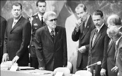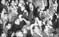 En el presídium, mientras tanto, Rodríguez Alcaine iniciaba sus infructuosos llamados al orden con manoteos y apremios a Gamboa Pascoe para que interviniera en su condición de presidente de la mesa, pero que éste simplemente dejó pasar. Los integrantes del gabinete foxista -Energía, Economía, Salud, Trabajo, Seguro Social, Infonavit-, los gobernadores de Durango, Sinaloa y Colima, el líder del Senado y los otros invitados se miraban entre sí, incapaces de generar una reacción.