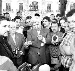SORPRESIVO DIALOGO  El gobernador de Jalisco, Francisco Ramírez Acuña, se dirigió a la plaza de armas de Guadalajara para dialogar con los disidentes del sindicato de burócratas que desde hace 22 días ocupan el quiosco, y les ofreció que sus reclamos salariales y de cese de hostigamiento a sus delegados serán atendidos en mesas de negociación, después del periodo vacacional FOTO ARTURO CAMPOS CEDILLO