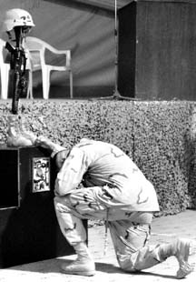 Un soldado estadunidense rinde honores durante un servicio religioso en la base aérea de Kirkuk a John D. Amos II, su compañero caído en un ataque con explosivos el 4 de abril pasado FOTO AFP