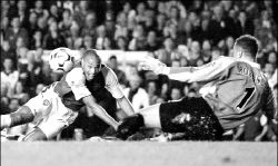 Thierry Henri, del Arsenal, supera al arquero de Leeds United, Paul Robinson, en duelo de la Liga Premier inglesa FOTO REUTERS