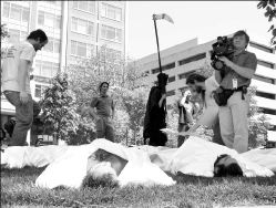 CONVOCAN A CACEROLAZO  Activistas que se manifiestan contra la reunión del Fondo Monetario Internacional y el Banco Mundial en Washington convocaron para este año a "un cacerolazo" al "estilo Argentina" para intentar hacer oír sus reclamos. "šSúmense al cacerolazo!", escribieron los organizadores en sus pancartas y volantes distribuidos entre los ciudadanos y por Internet para convocar a la manifestación de este sábado. La imagen, ayer frente a la sede de esos organismos internacionales FOTO LA JORNADA