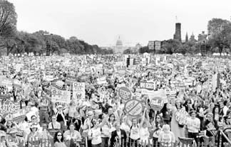 Con el Capitolio de fondo, los manifestantes -entre ellas actrices, abogadas, estudiantes y amas de casa- se congregaron en la "marcha por la vida de las mujeres" en el llamado Mall, parque central de Washington, en defensa de los derechos femeninos. Hubo cientos de pancartas que censuraban las recientes decisiones del presidente George W. Bush y del procurador John Ashcroft que limitan esas prerrogativas FOTO REUTERS