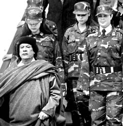 El líder libio, escoltado por su guardia de mujeres, arriba a Bruselas, sede de la Unión Europea. El dirigente, en el poder desde hace 34 años, se declaró comprometido con la paz e hizo un llamado al mundo a deshacerse de las armas de destrucción masiva FOTO AFP