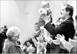 Su gusto por estar entre los voceadores se manifestó en besos a las mujeres, saludos y chanzas con los bebés y niños, hijos de los voceadores -a uno de ellos incluso lo hizo hablar ante el micrófono antes que él- en detenerse largo rato para saludarlos y despedirse. Reconocimiento, en fin, para quienes se levantan temprano "para salir a luchar por su familia, por México''.