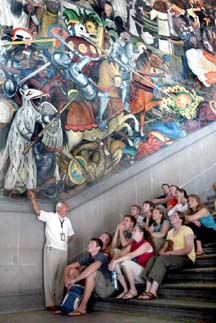 Un guía da explicaciones a un grupo de turistas sobre el mural México en la historia, de Diego Rivera, que se ubica en Palacio Nacional FOTO JOSE CARLO GONZALEZ