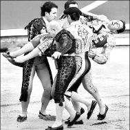 Los toreros españoles Luis Miguel Encabado y Pepín Lira resultaron heridos por sus respectivos astados durante la corrida de ayer en San Fermín, Pamplona FOTOS AFP