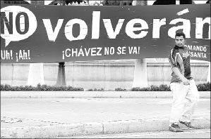 Pancarta en favor del presidente venezolano, Hugo Chávez, con motivo del referéndum revocatorio que enfrentará el mandatario el próximo día 15 FOTO AFP