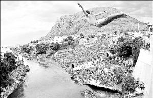 BOSNIA  Uno de los competidores en el tradicional concurso de clavados en el río Neretva, en Bosnia Herzegobina se lanza de la recién reconstruida plataforma de 22 metros de altura. En la justa, inaugurada la semana pasada, participan 75 concursantes provenientes de Eslovenia, Croacia, Serbia y Macedonia FOTO AFP