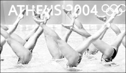 El equipo japonés de nado sincronizado practica en el Centro Olímpico Acuático en vísperas de la inaguración de los juegos Atenas 2004 FOTO AFP