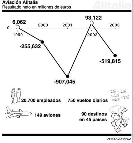 El plan de saneamiento presentado por la dirección de la compañía aérea Alitalia prevé suprimir 5 mil puestos de trabajo, según fuentes sindicales citadas este lunes por la agencia Ansa y Radiocor, reportó la Afp. Esta cifra fue anunciada el lunes en Roma por la dirección a las organizaciones sindicales durante una reunión. Unos 450 pilotos y mil 50 auxiliares de vuelo están considerados en esas supresiones de puestos, según las mismas fuentes. El presidente de Alitalia, Giancarlo Cimoli, estableció el 15 de septiembre como fecha límite para recibir el aval de los sindicatos a su plan de reactivación industrial para el periodo 2005-2008, condición indispensable para la atribución de un crédito de 400 millones de euros (unos 480 millones de dólares) garantizado por el Estado. La compañía emplea a unos 22 mil trabajadores.