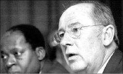 El nuevo director gerente del Fondo Monetario Internacional, el español Rodrigo Rato, ofreció una conferencia de prensa ayer en el aeropuerto de Johannesburgo, donde llamó a una conclusión rápida de las negociaciones comerciales, afirmando que los países ricos deben abrir sus mercados a Africa a más tardar a finales del año. "La futura prosperidad de Africa depende del aumento del comercio", afirmó Rato a reporteros tras una visita de dos días, su primera a Sudáfrica desde que asumió la jefatura del FMI, hace tres meses. Le acompaña Abdoulaye Bio-Tchane, de la oficina sudafricana del FMI. FOTO AFP