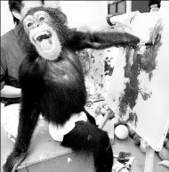 šQUE PINTORA TAN MONA!  En su estudio en la localidad de Ito, al suroeste de Tokio, la chimpancé Asuka, de tres años, realiza una de sus creaciones pictóricas, con miras a su próximo debut: una exposición de 50 cuadros en la capital japonesa FOTO REUTERS
