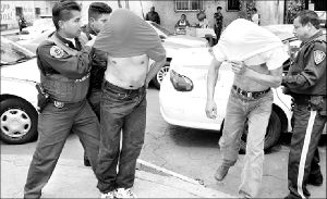 Policías preventivos someten a dos sujetos acusados de asaltar a los pasajeros de una combi, en Río San Joaquín esquina con Legaria FOTO ALFREDO DOMINGUEZ