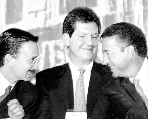 Carlos Levy, Jonathan Davis y Manuel Medina bromean durante la inauguración de la 15 Convención del Mercado de Valores FOTO MARCO PELAEZ
