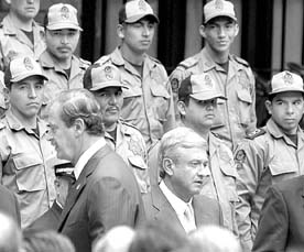 En la reunión del Consejo Nacional de Seguridad estuvo presente el tema del linchamiento de dos integrantes de la PFP en Tláhuac. Vicente Fox advirtió que "habrá más, más consignaciones", mientras el titular de la Secretaría de Seguridad Pública federal, Ramón Martín Huerta, sostuvo que en esa delegación "se vivió el combate del delito con el delito". Al acto acudieron Andrés Manuel López Obrador, jefe de Gobierno capitalino, y 13 gobernadores FOTO GERMAN ROMERO/ CUARTOSCURO