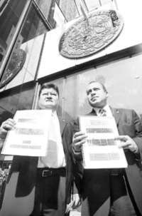 Los diputados locales Carlos Reyes G�z y Julio C�r Moreno exhiben la documentaci�ue fue entregada a la PGR FOTO Marco Pelaez