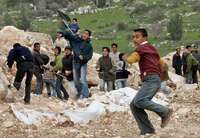 J�es palestinos lanzan piedras contra soldados israel� durante protestas en Kharas, cerca de Hebron, por la construcci�el muro FOTO Reuters